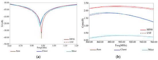 (a) Reflection coefficient S11 and (b) Gain versus frequency of proposed RFID tag placed on some human body regions (arm, chest, and wrist) in HFSS and CST solvers.