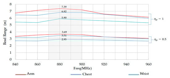 Figure 20 shows the simulated data of the theoretical read range between tag and reader. The best read range value of the tag is reached when placed on the planar form of the human arm phantom. The maximum read distance is almost 3.69 m in the case of a reader with circular polarization (), and it becomes 7.39 m in the case of a reader with linear polarization ().