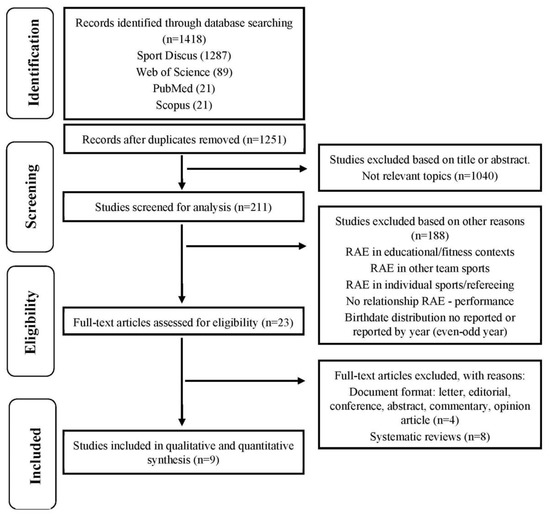 The authors worked separately and independently to ensure the reliability of the process and the suitable eligibility of the studies. According to the criteria for preparing systematic reviews “Preferred Reporting Items for Systematic Reviews and Meta-Analysis”—PRISMA [44], the protocol was carried out in the months of July and August 2020 and consisted in four stages (Figure 1): (1) Identification: The first author (A.d.l.R.R) found 1418 studies in the four digital databases; (2) Screening: The first author (A.d.l.R.R) eliminated the duplicate files (n = 167) and excluded those considered not relevant through a previous reading of the title, abstract and keywords (n = 1040). Furthermore, the first author (A.d.l.R.R), jointly with the second (J.L.C.), third (D.M.L.) and fourth author (A.L.), rejected the studies linked to the RAE according to the exclusion criteria through a full-text reading (n = 188); (3) Eligibility: The first (A.d.l.R.R), second (J.L.C.) and fourth author (A.L.) eliminated full-text studies from the selection process by the type of publication (n = 4) and systematic review (n = 8); (4) Inclusion: The remaining studies (n = 9) based on the relationship between the RAE and the competition performance in basketball were finally considered.