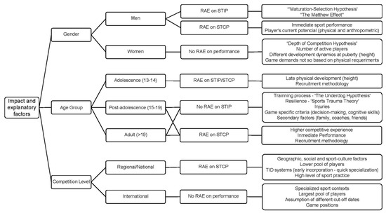 The RAE is a phenomenon normally reflected in youth categories. Thus, the relatively older athletes usually have more opportunities to achieve a higher sport level than their relatively younger counter-peers [19]. Researches have provided different explanations in this regard: Socio-cultural [20], geographic [21], psychological [22] criteria or those linked to the competition itself [23]. However, a biological factor associated with the “maturation-selection hypothesis” is the most cited argument [24,25]. This theory highlights the differences caused by the RAE among players in youth categories, especially in sports associated with a predominantly physical nature [26]. In addition, a different maturational status, due to the almost 12-month development process, would allow relatively older players to enjoy better physical, anthropometric and physiological qualities in compliance with the games’ demands. Consequently, older players may outperform their young sport peers [27].