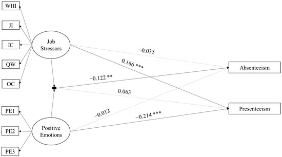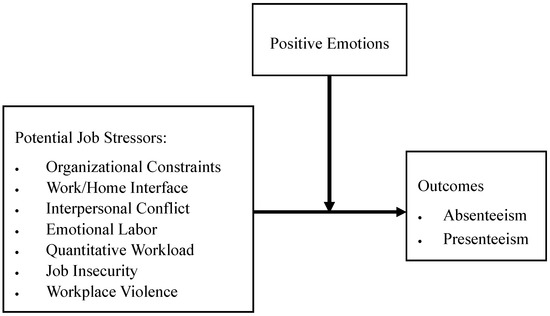 There is a possibility that positive emotions and job stressors may interact to exert an influence on employees’ absenteeism and presenteeism. Positive emotions were found to foster individuals’ effective coping [58] and proactive behavior [59]. Therefore, employees with higher levels of positive emotions were more likely to view job stressors as challenges and to actively cope with them. In addition, employees with higher positive emotions possessed abundant psychological resources when facing job stressors, which could build their confidence to successfully and flexibly handle them [60]. These two processes may contribute to decreasing employees’ absenteeism and presenteeism. With reference to job demands–resources theory [9], psychological resources may alleviate the detrimental impact of job demands on work performance through decreasing an employee’s strain. Therefore, positive emotions as a psychological resource could be a potential moderator of the negative impact of job stressors on absenteeism or presenteeism.