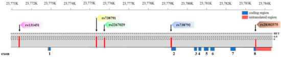 Five MMP-11 SNPs (rs131451, rs738791, rs2267029, rs738792, and rs28382575) with minor allele frequencies >5% were selected from the international HapMap project data for this study (Figure 1) [28]. The MMP-11 intron variant rs738791 and nonsynonymous SNP rs738792 (exon 2, Ala38Val) were selected because these gene polymorphisms were suggested to be associated with a greater risk of uterine cervical invasive cancer and HCC [22,23]. The MMP-11 SNP synonymous rs28382575 (exon 8, Pro475Pro) was selected because it was found that carriers with at least one polymorphic C allele (C/T + C/C genotype) were associated with a higher risk to develop large tumors, lymph node metastasis, or stage III/IV disease in HCC [22]. The MMP-11 SNP rs131451 was selected because this gene polymorphism was thought to potentially provide tumor markers in urothelial cell carcinoma (UCC) treatment or predictors for UCC susceptibility and prognosis [24]. The intron variant rs2267029 was selected in this study as in previous cancer research [20].