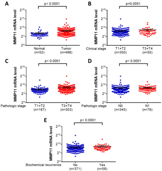 We further used data from The Cancer Genome Atlas (TCGA) data set to analyze and clarify the findings of our study. The results of the TCGA data showed that there were statistical significant differences between the MMP-11 mRNA level and the patients with prostate cancer and normal controls (p < 0.0001), clinical T stage (p = 0.0051), pathological T stage (p < 0.0001), pathological N stage (p < 0.0001) and biochemical recurrence (p < 0.0001) (Figure 2).