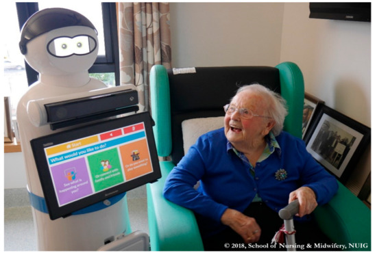 - Mordoch, E.; Osterreicher, A.; Guse, L.; Roger, K.; Thompson, G. Use of social commitment robots in the care of elderly people with dementia: A literature review. Maturitas 2013, 74, 14–20. [Google Scholar] [CrossRef]