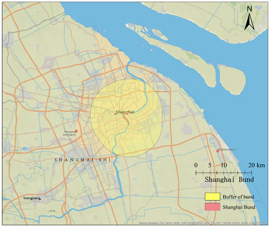 The Bund is a waterfront area in central Shanghai (shown in Figure 1). Centered on Zhongshan Road (East-1 Zhongshan Road), this area faces the modern skyscrapers of Lujiazui in the Pudong District. The Bund usually refers to the buildings and docks along this stretch of road, together with some adjacent areas. Chen Yi Plaza, lying in the middle of the Bund, links to the Huangpu River platform by a large and scenic staircase, which attracted a huge visitor flow, causing the highest population density during the New Year celebration [35]. In our research, we established a 10-km buffer zone for the Bund as representative of the Bund area (shown in Figure 2).