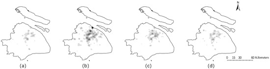 Check-in density between 12:00 on 31 December 2014 and 12:00 on 1 January 2015. Subfigures (a–d) show the spatial distribution of the check-in data during 31 December 2014 12:00–18:00, 31 December 2014 18:00–24:00, 1 January 2015 0:00–6:00 and 1 January 2015 6:00–12:00, respectively.