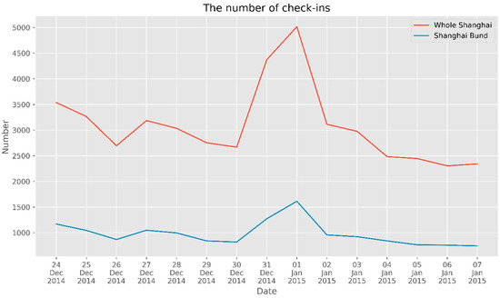 We calculated the number of check-ins in Shanghai and near the Bund each day from one week before to one week after the stampede (from 24 December 2014, to 7 January 2015), as shown in Figure 4. The red line in Figure 5 illustrates that the number of check-ins in Shanghai from 31 December 2014, to 1 January 2015 (the time of the disaster) was almost two times the peak value at other times. Additionally, the blue line, which represents the number of check-ins around the Bund, shows that there was a peak in Weibos during the disaster period. Furthermore, both the red line and the blue line show that the number of check-ins on New Year’s Eve in 2014 apparently exceeded the number of check-ins on Christmas Day.