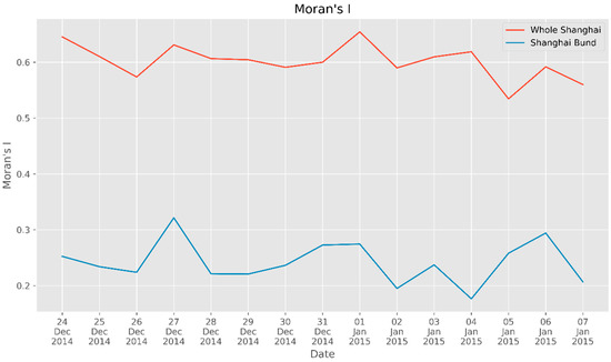 The blue line in Figure 6 shows Moran’s I around the Bund, from which we can conclude that there was considerable spatial aggregation in the Bund area (the average value of Moran’s I was greater than 0), but this finding is not as obvious as that at the municipal scale. However, Moran’s I on New Year’s Eve was apparently higher than the index values on the days before and after the stampede, as well as the average value of the blue line.