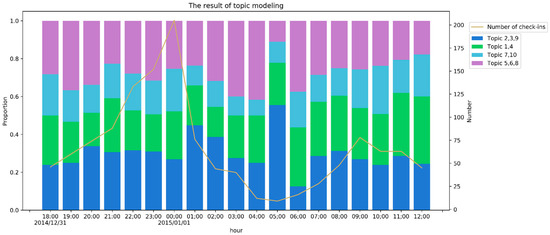Figure 7 shows the usage frequency of each class in each hour from 31 December 2014 at 18:00:00 to 1 January 2015 at 12:00:00. The line chart in Figure 7 shows the number of check-ins in each hour. As shown in Figure 7, omitting three hours (1 January 2015 4:00–7:00) with very few check-ins, the proportion of the first class from 31 December at 20:00 to 1 January at 3:00 was 31.77%, higher than those at other times. The proportion of the first class from 1 January 2014, at 1:00 to 1 January 2015, at 2:00 was the highest, reaching 44.73%. Thus, people complained about crowding beginning at 20:00, which basically matches the process described in the report [4]. For the second class, the proportion of posts was higher after 1 January at 7:00 than on 31 December, suggesting that most people talked about the absence of celebration around the Bund the day after the event. For the check-in data outside the Bund in Shanghai, only one topic is related to the stampede. This low proportion also reflects the significant spatial autocorrelation characteristics of the stampede based on check-in data.