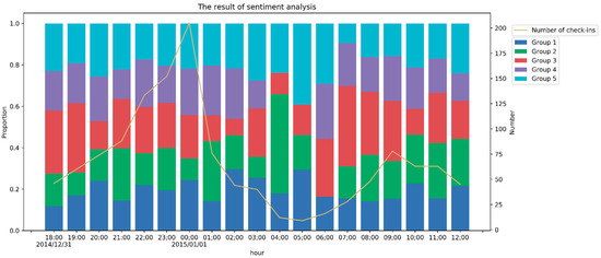 The histogram in Figure 8 shows the usage frequency of each group in each hour, and the line chart shows the number of check-ins in each hour. Excluding the three hours (1 January 2015 from 4:00–7:00) with very few check-ins, we can conclude that the proportion of negative sentiment (Group 1 and Group 2) increased in two periods: from 31 December at 20:00 to 1 January at 2:00 (40.95%) and on 1 January from 10:00 to 12:00 (44.33%). The first period was when the stampede occurred. In addition, Group 3 accounted for a minor proportion of posts during the event, suggesting that people shared an apparent sentiment inclination. For comparison, the proportion of negative sentiment (Group 1 and Group 2) from 31 December at 18:00 to 31 December at 20:00 is 27.83%.