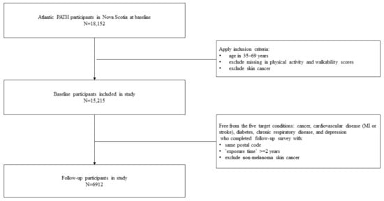 Nova Scotia is one of four Atlantic provinces located on Canada’s east coast. It is the most populated province of the Atlantic region, with a population of 977,274 [14]. Halifax is the province’s capital city and accounts for as much as 45% of the province’s populace [15]. For the purposes of aim 1, the Atlantic PATH participants included in the baseline analyses (N = 15,215) were between the ages of 35 and 69 years old, living in Nova Scotia at the time of baseline assessment (2009–2015) with non-missing walkability and physical activity data. For aim 2, the Atlantic PATH participants included in the prospective analyses (N = 6912) were living in Nova Scotia at both baseline and follow-up assessments (2016–2019), were residing in the same postal code area for at least two years, had not self-reported any of the five chronic diseases examined in aim 1, and had non-missing walkability and physical activity data. The participant data flow is shown in Figure 1.