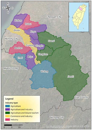 The terrain of Hsinchu County is mainly composed of flat land, hills, and mountains. There are 13 administrative districts (towns and cities), and its development industries are diverse; they can be mainly classified into agriculture, industry (including science and high technology), commerce, and leisure tourism (Figure 1). Zhubei City is an important town in terms of commerce, economics, and politics; its industries develop high-tech electronics (such as in the Taiyuan Science and Technology Park). The inflow of industrial capital into Zhudong town comprises real estate capital and high-tech manufacturing capital. Like those of Zhubei City, its industries comprise mainly commerce and industry (such as the Industrial Technology Research Institute). The Hukou and Baoshan Townships have the most developed industries and are the production bases for the technology and manufacturing industries, such as the Hsinchu Industrial Park of the Industrial Development Bureau, the Ministry of Economic Affairs in Hukou Township, and high-tech companies such as Taiwan Semiconductor Manufacturing Company and other high-tech factories in Baoshan Township. Baoshan Reservoir and Baoshan Second Reservoir are important water resources for the Hsinchu Science Park. Moreover, the Emei and Wufeng Townships focus on agriculture (tea, oranges, peaches, and sweet persimmons). The Xinfeng, Xinpu, Qionglin, and Beipu Townships exhibit agricultural activities and the establishment of regional industrial zones for the industrial development. Guanxi town, Jianshi Township, and Hengshan Township focus mainly on agriculture and the development of tourism and leisure industries (such as Guanxi Grass, Neiwan Old Street, orchard sightseeing, and visits to the Taiwanese aboriginal people).