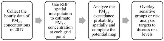 The potential refers to the frequency or probability of the occurrence of disasters in an area; the determined potential can be used as a reference for future risk assessments. In this study, the hourly data of PM2.5 concentrations measured by the TWEPA in Taiwan in 2017 were used, and spatial interpolation was applied to estimate the hourly PM2.5 concentration of each grid point in the county. Subsequently, the probability that the PM2.5 concentration of each grid point exceeds the standard value statistically was calculated. The air quality index that corresponds to the unhealthy PM2.5 concentration for sensitive groups (35.4 μg/m3) was used as the concentration standard. This probability can be represented based on the exceedance probability of older data, which represents the spatial distribution of the potential of PM2.5. The analysis process is shown in Figure 2.
