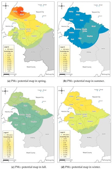 Distribution of PM2.5 potential in the study area in Hsinchu County in different seasons. Overall, 76 air quality-monitoring stations of the Taiwan Environmental Protection Administration (TWEPA) across the whole of Taiwan were used for spatial estimation, and we extracted the region of Hsinchu County for further analysis. (a) PM2.5 potential map in spring. (b) PM2.5 potential map in summer. (c) PM2.5 potential map in fall. (d) PM2.5 potential map in winter.