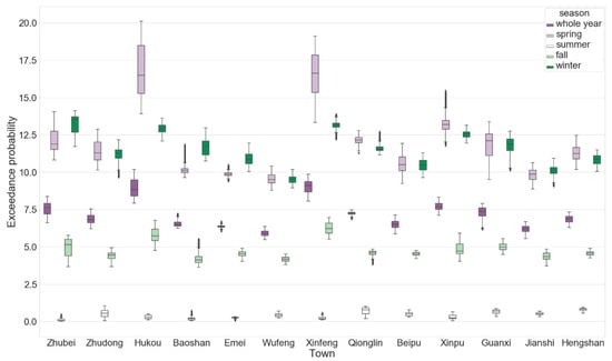 The PM2.5 concentration is greatly affected by meteorological factors; therefore, the data were investigated according to the different seasons (spring: March–May; summer: June–August; autumn: September–November; winter: December–February). The results are shown in Figure 3. The gray area is too far from the air quality station and was therefore excluded. The analysis results show that the pollution potential in spring (Figure 3a) and winter (Figure 3d) is higher; the probability that the standard concentration in all towns and cities is exceeded is 9.5%, particularly in spring when the Xinfeng and Hukou Townships have probabilities of more than 18%; the probability decreases from the northwest plain area to the southeast mountainous area. The pollution potential in summer and autumn is relatively low; the probability that the standard is exceeded in autumn is generally only approximately 5%. The potential in the northern area of Hsinchu County adjacent to Taoyuan City is higher. In summer, the probability does not exceed 1%, and the probability of pollution in the area near Zhudong Station is slightly higher. Figure 4 and Table 2 show the detailed boxplots and basic statistics of the exceedance probabilities of the 13 townships and cities in Hsinchu County, respectively.