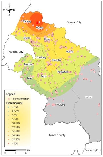 After determining the spatial distribution of the air pollution potentials, the air pollution risk levels in various tourist areas in Hsinchu County were examined. As shown in Figure 2, the PM2.5 concentrations are based on data from the TWEPA’s Taiwan-wide air quality-monitoring stations from 2017; in addition, radial basis function (RBF) spatial interpolation was used to estimate the grid-like PM2.5 concentrations in the Hsinchu County area, and the exceedance probability method was applied to calculate the probability that the PM2.5 concentration of each grid point exceeds the standard. Finally, the potential air pollution risks in the areas of the major tourist attractions in Hsinchu County were examined. The PM2.5 concentration standard used in this study is based on the air quality index, which considers six levels: good, normal, unhealthy for sensitive groups, unhealthy for all people, very unhealthy, and hazardous. When the “unhealthy for sensitive groups” degree has been reached, it is generally recommended that residents reduce outdoor activities and prolonged vigorous exercise. Therefore, the PM2.5 concentration standard (35.4 μg/m3) corresponding to the “unhealthy air quality for sensitive groups” degree was used as the threshold. In this study, the analysis results of the probability that the PM2.5 concentration exceeds the standard were classified into eight levels. In addition, most areas of the Jianshi and Wufeng Townships are too far from the TWEPA’s air quality monitoring station (15 km from the monitoring station) and mainly in high mountainous terrain; thus, they were not included in the calculations.