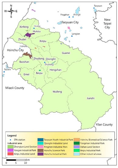 Hsinchu County in Taiwan has diversified industry, with equal emphasis on agriculture, industry, technology, businesses, and leisure tourism. In addition, Hsinchu County is adjacent to Hsinchu City and Hsinchu Science Park. The population and industry are developing rapidly, and large numbers of people enter Hsinchu County’s major tourism and recreation areas every holiday season. Therefore, high air quality around tourist attractions is very important. A previous study of the characteristics of air pollutants in Hsinchu has shown that the PM2.5, total PAHs (Polycyclic Aromatic Hydrocarbons), and BaPeq (benzo(a)pyrene equivalent) mass concentrations during the seasons had the following order: winter > autumn > spring > summer with significant seasonal variations []. Some early studies focused on the impacts of the large and dense high-tech industries in the Hsinchu Science Park on health and the environment [,,]; in addition, the researchers considered the emissions of toxic compounds such as VOCs (Volatile Organic Compounds) and arsenical emissions; however, there have been few relevant studies in the past decade.