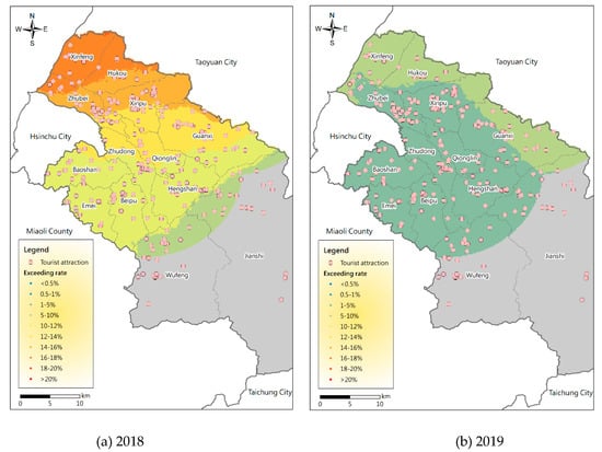 In order to further compare the PM2.5 potential distribution in different years, in addition to Figure 5 showing 2017, Figure 8 shows the dynamic distributions of PM2.5 potential in tourist areas in Hsinchu County in spring in 2018 and 2019. They show spatial distributions similar to 2017, and Xinfeng and Hukou also have the highest potential. However, it is obvious that the overall probability of PM2.5 exceeding the standard has been declining in the entire region in recent years. In addition to the influences of meteorological conditions in different years, it may be due to the implementation of government policies and the increase in people’s awareness of environmental protection.