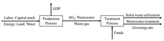 DEA is a mathematical programming model which evaluates the comparative efficiency of DMUs, calculating a relative ratio of weighted outputs to weighted inputs for each DMU and explores the best-performing frontiers over the sample data []. Initially DEA was implemented in the radial distance []. Non-radial measures were developed to take desirable properties into consideration [,,]. Since then, Cooper and Pastor [], Briec [], Cooper et al. [] and Pastor et al. [] developed the DEA framework. The method is applied to estimate the efficiency or effectiveness of a system based on various input and output indicators []. The DEA method has some unique advantages in calculating the efficiency of the DMU []. The latest network DEA model considers and connects the indirect input and outputs during a complete economic production process and network. Specifically, two stage DEA is a commonly used model of network DEA. By decomposing the input-output process into production process and environmental governance process, the “black box” of the relationship between elements is opened [].