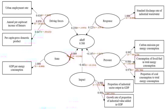 Table 4 illustrates the ultimate outcomes of the indexes, which influence the eco-efficiency of various stages. At the same time, the estimated structural pathways of various stages in the DPSIR model are calculated and examined with the PLS method. To determine the reliability and validity the DPSIR model, the convergence reliability (CR) needs to be higher than the minimal requirement of −0.7. Moreover, the AVE must surpass 0.5 and be larger than the relevant coefficient of primary indexes simultaneously. As shown in Table 4, the CR and AVE meet the minimal requirement, which means that the model is reliable and valid.