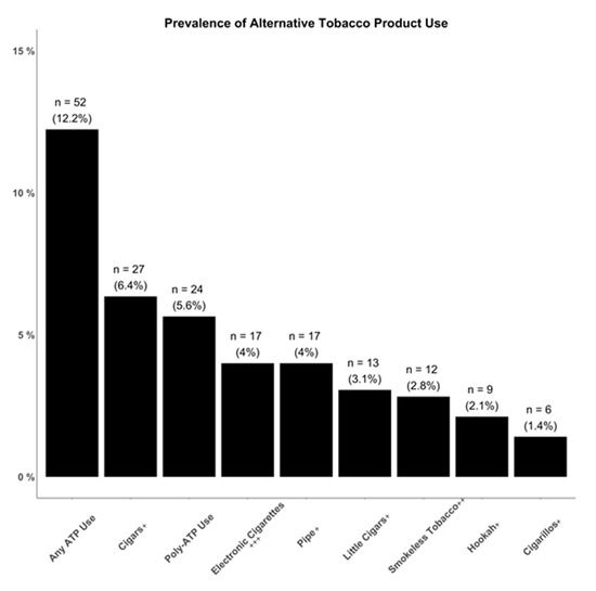 Of the participants with a completed survey, 12.2% (n = 52) reported use of any ATPs, while 5.6% (n = 24) reported currently using multiple ATP products (Figure 1). Overall, 4% (n = 17) reported using electronic cigarettes, 2.8% (n = 12) reported using smokeless tobacco, 6.4% (n = 27) reported using cigars, 3.1% (n = 13) reported using little cigars, 1.4% (n = 6) reported using cigarillos, 4% (n = 17) reported using pipe, and 2.1% (n = 9) reported using hookah (Figure 1).