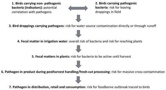 Our study looked at filling the information gap regarding the potential contamination by bird-shed pathogenic bacteria in the upstream of the food production-supply chain of leafy greens (points 1–5 in Figure 1). The scope of the study did not include further steps in the downstream side of the supply chain (postharvest handling, retail, consumption).