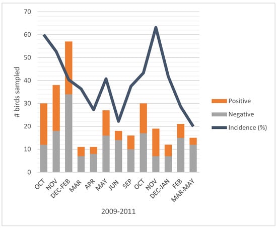 The months of October, November and December showed the highest incidence of birds with non-pathogenic E. coli. The probability (odd ratio) of finding birds shedding E. coli during the last three months of the year was found to be at least 50% higher than that in previous months of the year (Figure 3).