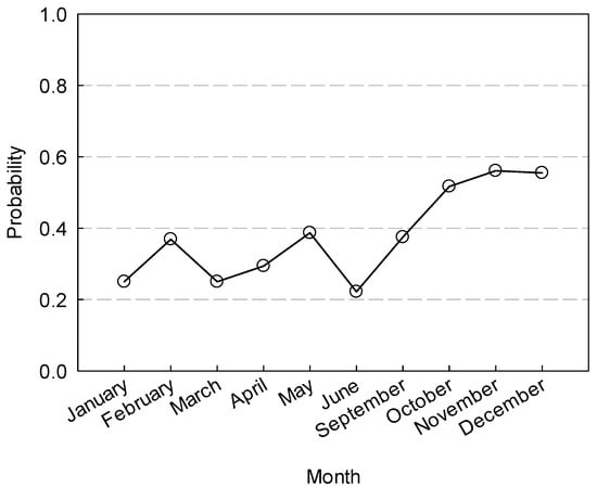 Monthly predicted probabilities (odd ratio) of the occurrence of non-pathogenic E. coli in birds roaming lettuce fields in the Yuma area. Actual individual observations were either “0.0” indicating no incidence of bacteria or “1.0” indicating bacteria was recovered.