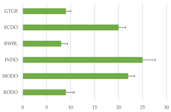 Average number of days birds in captivity remained shedding generic non-pathogenic E. coli. Error bars are the standard errors of the mean. Note: Birds were released on day 30, when MODO (22 out of 67), and INDO (8 out of 15) were still shedding E. coli. Number of birds in captivity for other species was 8 for GTGR, 24 for ECDO, 27 for RWBL and 15 for RODO.