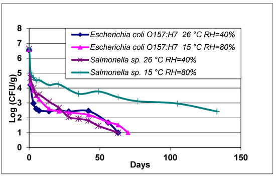 The possible role of relative humidity within the crop canopy on Salmonella detection was evaluated in the laboratory and the results confirmed significantly longer period of recovery at a RH of 80% than at 40%. This was observed despite the fact that the latter RH was simultaneously at a closer to optimal temperature for bacterial growth (26 °C) than the former (15 °C). The recovery of E. coli O157:H7 was 7 days longer at 80% RH/15 °C than at 40% RH/26 °C. The analysis of Salmonella showed more pronounced differences, with samples at 80% RH/15 °C still recovering the pathogen after 132 days (presence at above 2 Log CFU/g), when there was no recovery of the bacteria at 40% RH/26 °C (Figure 5). The survival of E. coli O157:H7 at 26 °C/40% RH and 15 °C/80% RH was not significantly different (p > 0.05). A significant difference (p < 0.05) was observed for the survival of Salmonella at 26 °C/40% RH and 15 °C/80% RH.