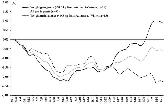 Bonferroni’s correction was used for multiple comparisons of body weight, physical activity, energy intake, and sleep conditions for three seasons. Student’s unpaired t-tests were used to compare body weight, physical activity, energy intake, and sleep conditions between the weight gain and maintenance groups. For assessment of seasonal variations in body weight, daily body weight in each participant was smoothed over a 7-day running-average window and averaged over the participants in groups. Based on previous studies [,], participants whose body weights increased by ≥0.5 kg from autumn to winter were included in the weight gain group. Participants whose weights did not increase by ≥0.5 kg were included in the weight maintenance group. All data are presented as means ± standard deviations. The significance level for all statistical tests was set at p < 0.05. All data were analyzed using IBM SPSS Statistics for Windows 8.1 (version 22.0; IBM Corp, Armonk, NY, USA).