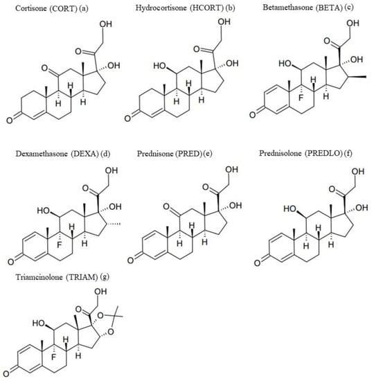 Molecular structures of the investigated glucocorticoids (GCs). (a): cortisone; (b): hydrocortisone, (c): betamethasone, (d): dexamethasone, (e): prednisone, (f): prednisolone and (g): triamcinolone.