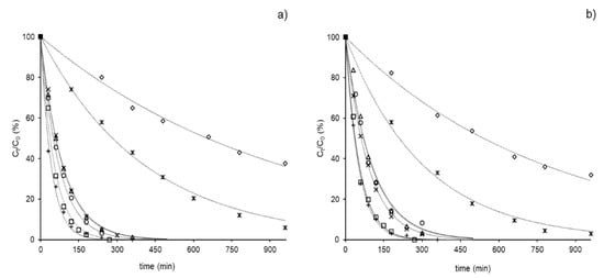 Evolution profiles of each GC (50 µg L−1) both in tap (a) and river water (b) under simulated sunlight cortisone (CORT) (◊), hydrocortisone (HCORT) (✴), betamethasone (BETA) (×), dexamethasone (DEXA) (∆), prednisone (PRED (☐), prednisolone (PREDLO) (+) and triamcinolone (TRIAM) (○) (see Section 2.2. for the irradiation conditions).