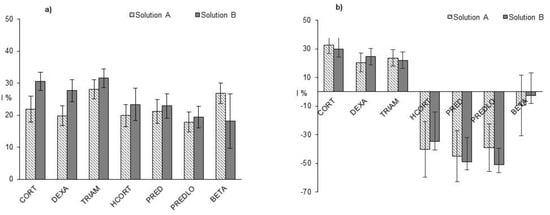 In details, in tap water (Figure 2a), PRED and PREDLO were fully degraded in about 3 h, BETA, DEXA and TRIAM in about 5 h, while CORT and HCORT decreased more slowly, and about 38 and 6% of the initial amounts, respectively, were still present after 16 h of exposure.