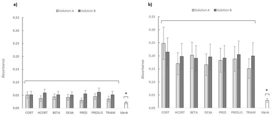 The HPLC-UV system consisted of a Shimadzu (Shimadzu Corporation, Milano, Italy) LC-20AT solvent delivery module equipped with a DGU-20A3 degasser and interfaced with an SPD-20A UV detector. The wavelength selected for analysis was 238 nm that is included in the absorption band of all the GCs. Each sample was diluted (30% v/v) with MeOH and injected (20 µL) into a 250 × 4.6 mm, 5 µm GraceSmart RP18 (Sepachrom) column, coupled with a similar guard-column. Isocratic elution was carried out for 20 min using ultrapure water–ACN mixture, 70:30 for CORT, HCORT, PRED and PREDLO; 65:35 for BETA, DEXA and TRIAM. After washing for 5 min with 100% ACN, the initial conditions were reestablished. The flow rate was 1.0 mL min−1. The instrumental quantification limits were 0.3 mg L−1 for CORT, HCORT and DEXA, 0.09 mg L−1 for BETA, 0.2 mg L−1 for PRED, PREDLO and TRIAM.