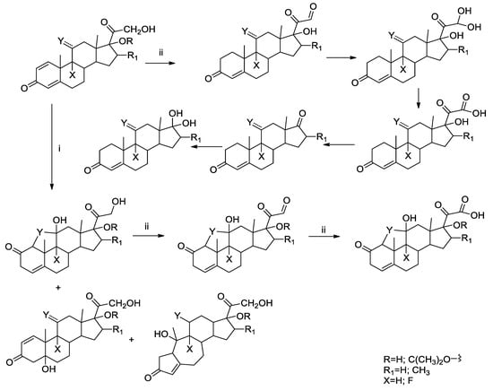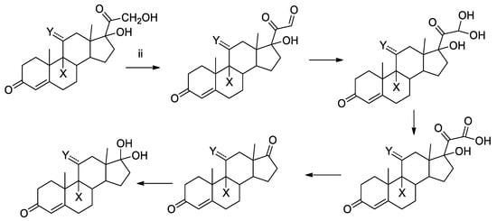 When no isomerizable moiety is present, the main reactivity site of compounds a,b is the hydroxyl acetone moiety in position 17. As a consequence, some products were identified (see Scheme 1), and the structures were proposed based on their MS/MS fragmentation pattern (see Tables S4 and S5) and in accordance with literature data [,]. The subsequent oxidation-hydration steps (ii) proceed via a series of derivatives, well in accordance with the stepwise conversion to aldehyde, acetal, carboxylic acid, ketone and ketal.