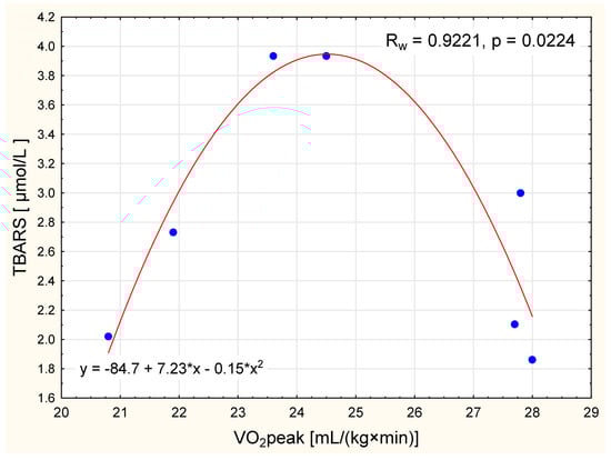 Though mean TBARS concentration has not changed in the NW group, we detected a nonlinear squared correlation between VO2 peak and TBARS concentration in normal-weight women after the IC intervention. For women with a VO2 peak up to 24.5 mL/(kg×min), the higher the oxygen uptake the higher the concentration of TBARS. In contrast, in women with higher VO2 peak values, higher the oxygen uptake levels corresponded to lower concentrations of TBARS (Figure 2).