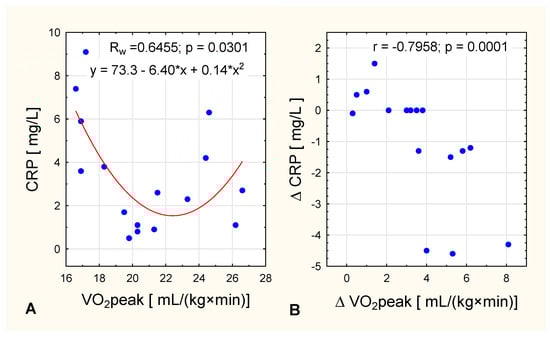 We detected an interesting nonlinear squared correlation between VO2 peak level CRP concentration in women with obesity after the intervention. In women with lower oxygen uptake [up to 20 mL/(kg×min)], CRP concentration fell as oxygen uptake got higher, whereas in women with higher VO2 peak values [more than 20 mL/(kg×min)] CRP concentration increased as oxygen uptake got higher (Figure 3A). In the same group, it was observed that the greater the increase in VO2 peak, the lower the change in CRP (Figure 3B).