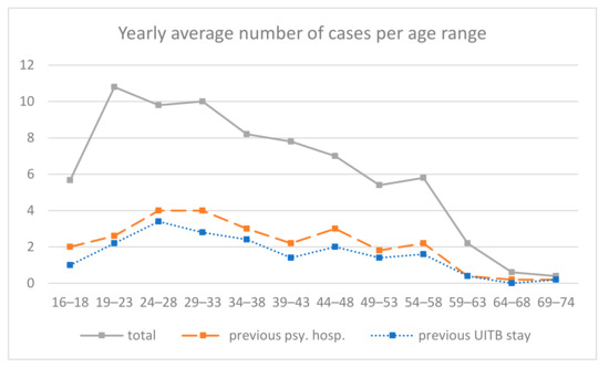 Prior to our planned analysis, we examined the number of patients admitted for suicidal crisis according to age, and we inspected the relation between previous psychiatric hospitalization and previous stay at UITB, i.e., of unambiguous previous suicidal crisis (Figure 2). The curve of the average number of hospitalized patients per age range (grey) shows a pattern consistent with a previous study [5], with a peak around 20 years old, then a plateau, before a decrease around 36 years old. The same curves only for patients with previous psychiatric hospitalization (orange) or with previous stay at UITB (blue) show a strong parallelism, suggesting that those two conditions are closely related. Indeed, statistical tests indicated a strong association between previous psychiatric hospitalization and previous stay at UITB: Khi2 = 217.6, p < 0.001, and OR = 305.7, 95% CI 71.9–1299.2.
