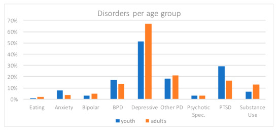 Table 2 summarizes frequencies of disorders, treatments, previous psychiatric hospitalization, and reasons for hospitalization observed in our population. The dominant disorder observed in both groups was depression (Figure 3), which was more frequent in adults (67.1%) than in youth (51.4%, Khi2 = 7.73, p = 0.005). It was followed by personality disorders (18.1% in youth, 21% in adults), especially borderline (17.1% and 13.5%) with no difference between age groups (respectively Khi2 = 0.397, p = 0.529, and Khi2 = 0.794, p = 0.373). The third most frequent disorder was Post-Traumatic Stress Disorder (PTSD), higher in the youth group (29.5%) than in the adult one (16.3%, Khi2 = 8.09, p = 0.004). Substance use disorder was tendentially higher for adults (13.1%) than for youths (6.7%, Khi2 = 3.08, p = 0.079).