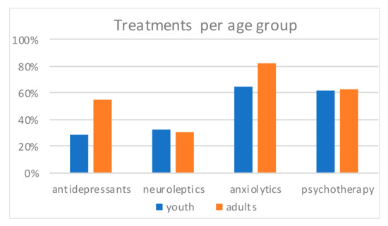 The most frequent treatment reported was anxiolytics (Figure 4), then psychotherapy, and at last antidepressants and neuroleptics. Psychotherapy (youth 61.9% and adults 63.1%) and neuroleptics (32.4% and 30.2%) were equally observed in both groups (Khi2 = 0.017, p = 0.897, and Khi2 = 0.119, p = 0.73). Antidepressants were more frequent in adults (54.8%) than in youths (28.6%, Khi2 = 10.8, p = 0.001). Anxiolytics were tendentially more frequent in adults (82.1%) than in youths (64.8%, Khi2 = 2.91, p = 0.088). Within groups, frequencies of treatments were different (for youth, Khi2 = 24.4, df = 3, p < 0.001, for adults Khi2 = 61.0, df = 3, p < 0.001).