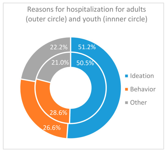 Across our cohort of 357 patients, we observed a higher prevalence of hospitalized women vs. men (77.1% in youth, 68.7% in adults), making an average female to male ratio of 2.4, which is the inverse of the death by suicide reported ratio of 2.2 men for 1 woman observed in Switzerland [35]. This “gender paradox” has already been described in studies on adults and youths [43,44], which propose that factors out of the scope of this study are involved: socio-economical context and life events for women, and access to means and impulsivity for men.