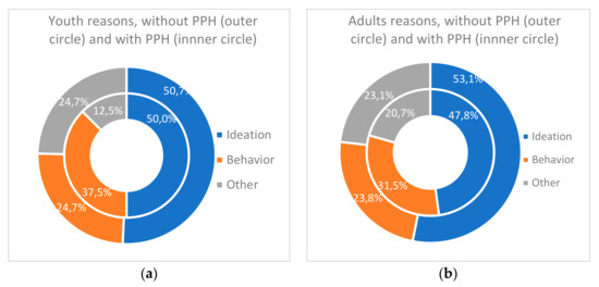 Frequencies of reasons for hospitalization according to previous psychiatric hospitalization (PPH), (a) for youth; (b) for adults.