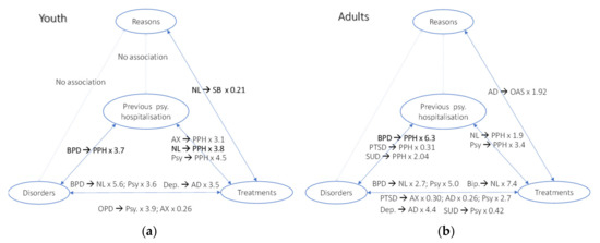 Figure 7a (youth) and b (adults) illustrates our findings regarding associations between variables for both groups. Associations are not directional, arrows in the legends indicate in which direction the odds ratios play, e.g., in the youth group, there is an association between disorder and previous psychiatric hospitalization, namely, BPD was found associated with an OR of 3.7 with previous psychiatric hospitalization, i.e., we observed in our study that youth with BPD had 3.7 more chance to have had previous psychiatric hospitalization.