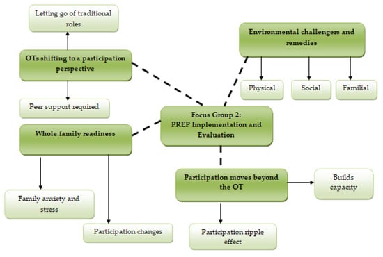 Four themes were identified when implementing PREP and evaluating OT experiences of implementation: shifting to a participation perspective; participation moved beyond the OT; environmental challengers and remedies; and whole family readiness (Figure 3).