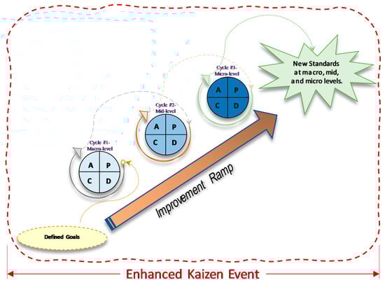 35]. In our case, we used a different approach in which one EKE was composed of several improvement cycles along an improvement ramp; going through the improvement ramp was our EKE. The first cycle consisted of improvements at the departmental level (macro-level). The second cycle focused on improvements in an area within the department (mid-level). Finally, the third cycle made improvements at the station level (micro-level). To the best of the authors’ knowledge, this approach has not been reported in the literature before.