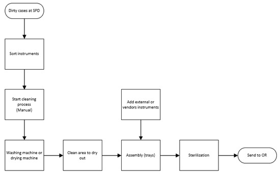 This case study was performed at the SPD of a medium-size local hospital. The hospital is an Acute Care facility, a medium volume, 86 bed facility, with over 2000 employees of which 200 are physicians. The health professionals cover over 35 specialties and compose more than 20 clinics. SPD supports seven existing surgical suites (six surgery and one procedure room), Labor and Delivery, Emergency Department, Diagnostic & Treatment areas, patient beds, and associated on-site clinical programs. It also provides processing for the regional veterinary clinics.