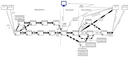 Figure 4 presents the current state VSM. The VSM revealed that there was a lot of stagnation occurring between processes. Besides, there were a few workarounds at some operations. There was also a preemptive priority process that occurred every time the OR signaled that they needed some tools immediately.