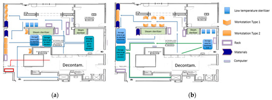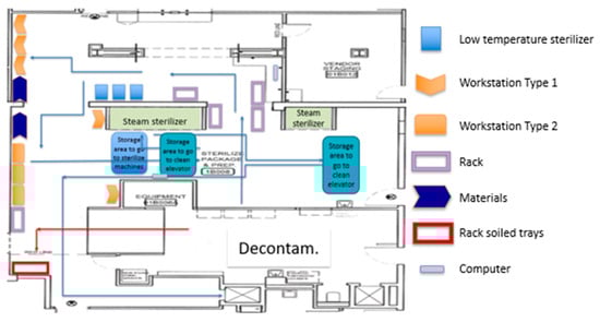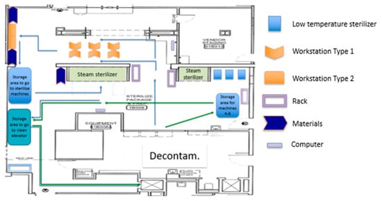 Figure 10 exhibits the first proposed layout designed by the team. According to the first proposed layout, the low-temperature sterilizers were relocated to the Sterile Processing area. With this relocation, all the workstations were situated in the Prep and Pack area.