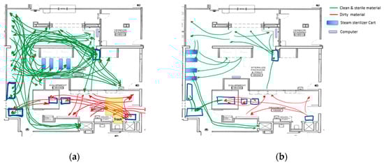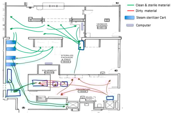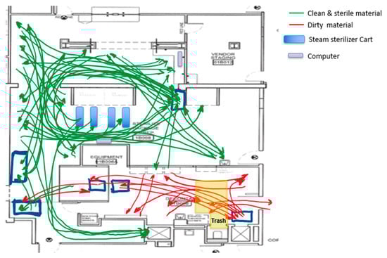 Figure 14. presents the spaghetti diagram after the new layout was implemented. The new disposition reduced over 35% in walking distance (between workstations and equipment) and established a more streamlined workflow. Since the macro-level changes focused on designing the layout by separating the department into three major areas, cross-traffic between storage areas for dirty, clean, and sterile instrumentation was eliminated. This practice has been sustained due to the physical separation of the areas.